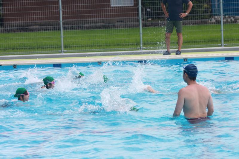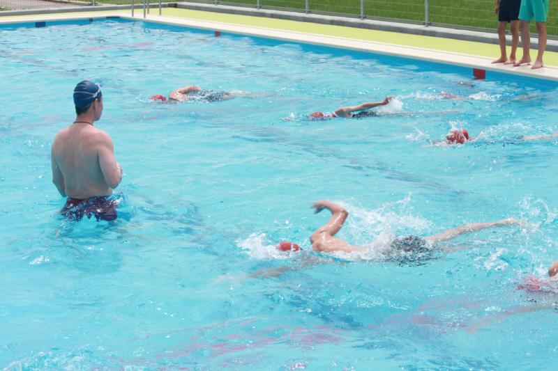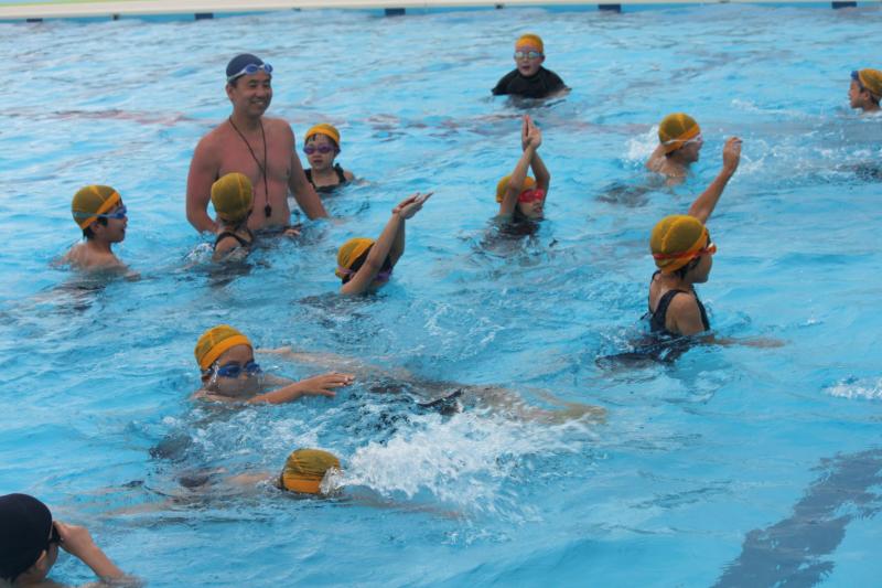 例年に習い、本年度も新田先生に来ていただき、1年生から6年生が水泳指導をしてもらっています。