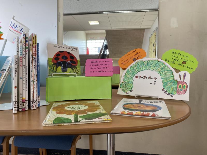 先日91歳でなくなった絵本作家「エリック・カール」さんの絵本コーナーも設けてあります。この機会に手に取ってみては、どうでしょう。絵にも圧倒されます。英語つきの絵本もありますよ。