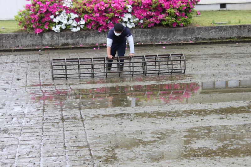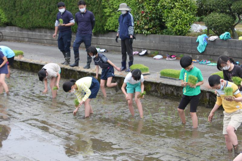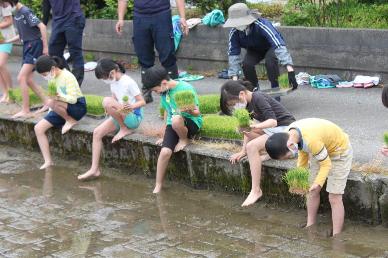昨年度の5年生(6年生)は、コロナによる臨時休業で、田植えを体験することができませんでした。今年度は、お天気にも恵まれ、無事、田植え体験をすることができました。