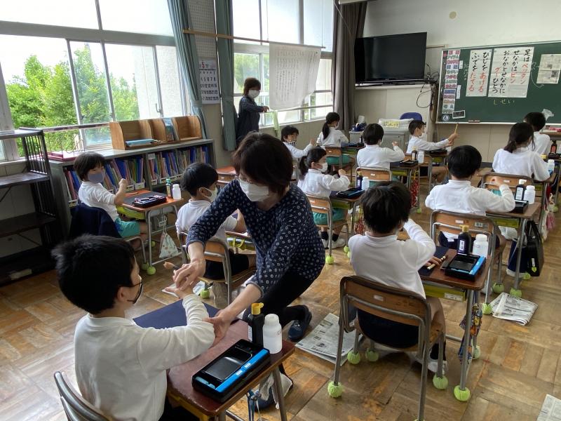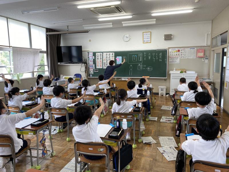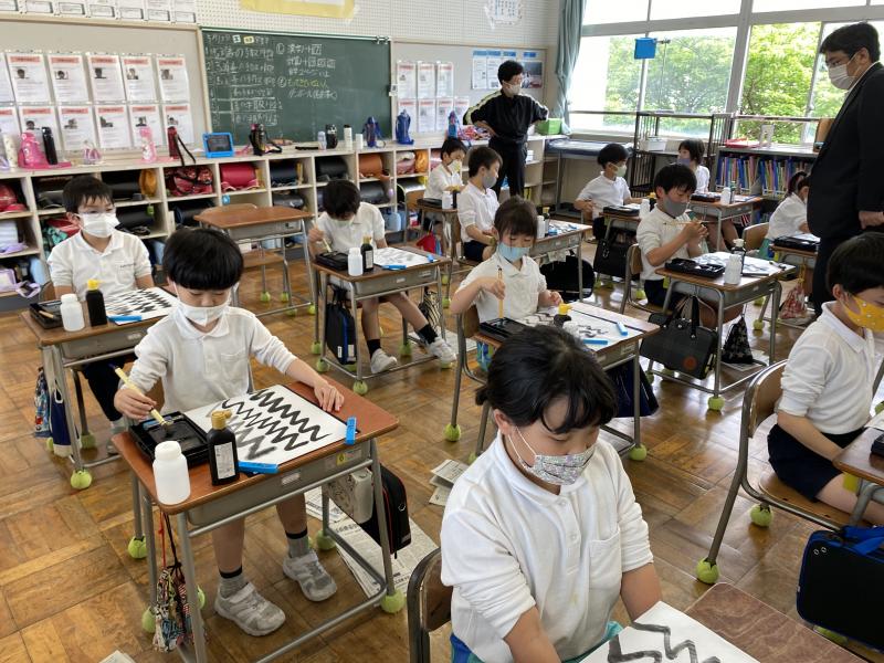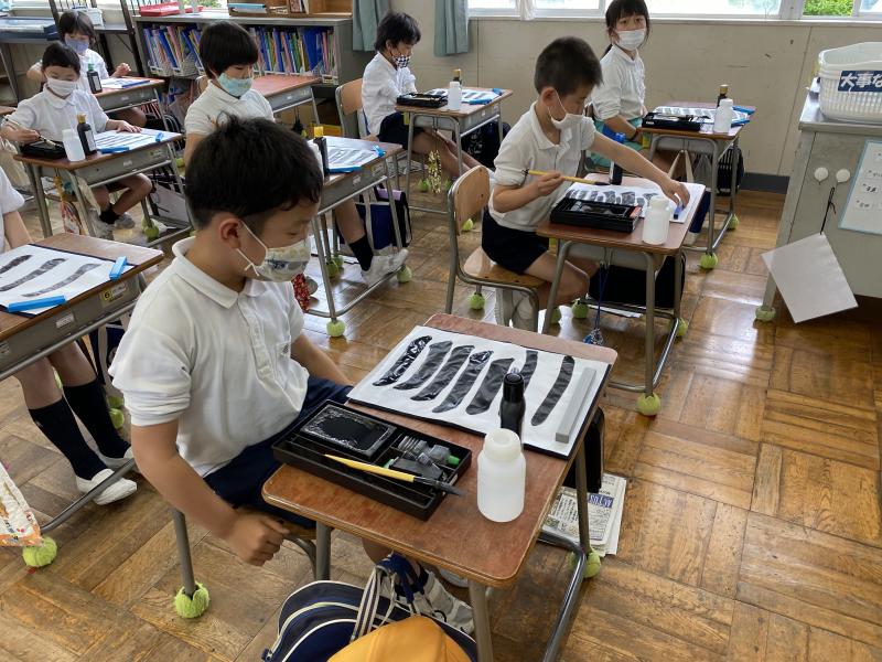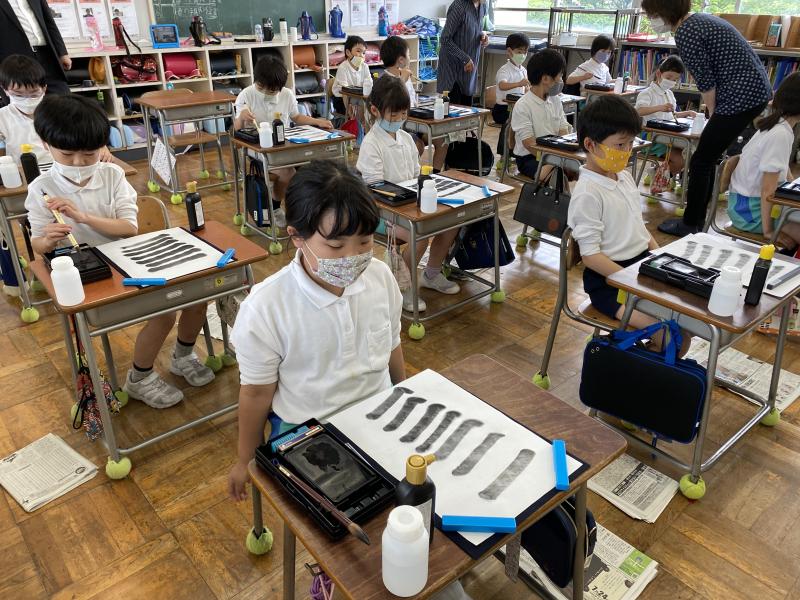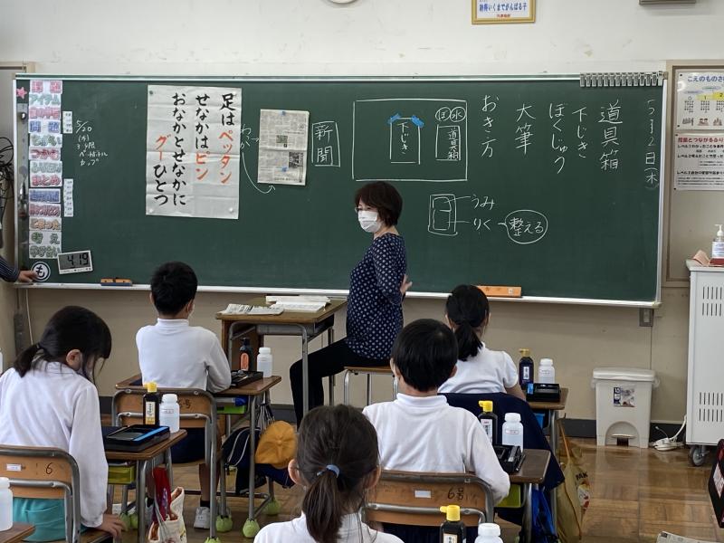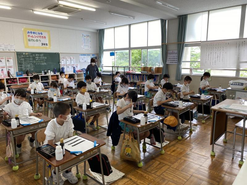 2年時に水筆を体験し、3年生になって初めて毛筆で書写をします。地域の山本真弓先生から指導を受け、道具の名前や、置き方、基本的な姿勢、筆の持ち方、使い方等を習い、一日で大変上手になりました。