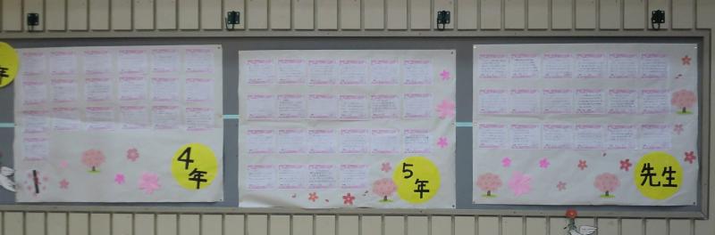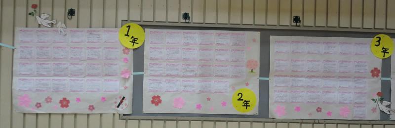 1年生・2年生・3年年・4年生・5年生、先生からのメッセージを 5年生が掲示してくれた体育館に