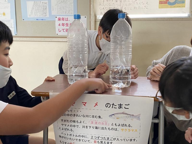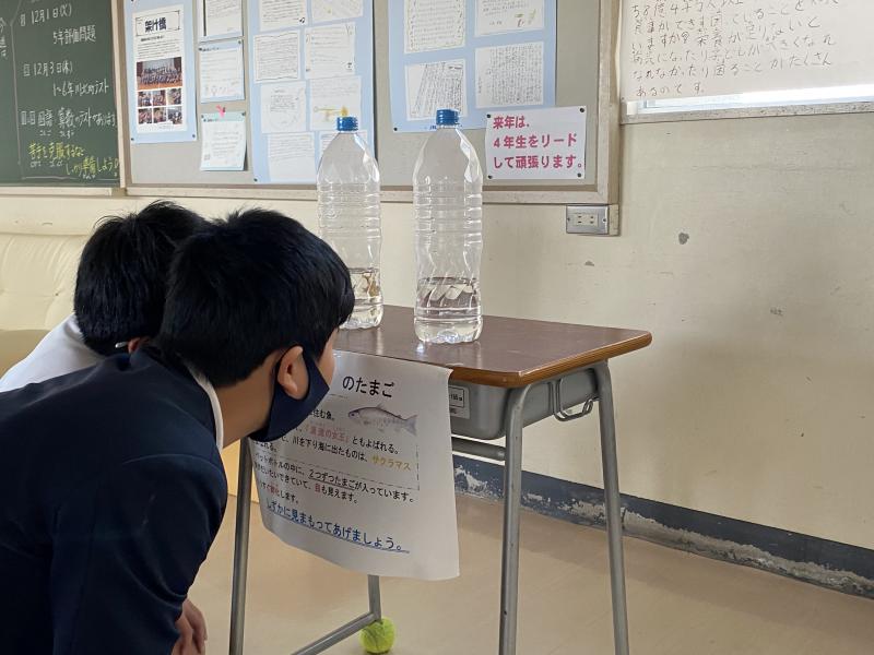 えさをやらなくても、おなかの栄養で生き続け、おなかがだんだん小さくなってくる様子を毎日熱心に観察する児童達でした。