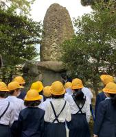 最後に,橘樹神社で石碑を読んでもらい、人々のご苦労に思いをはせながら、復興の歌を歌いました。