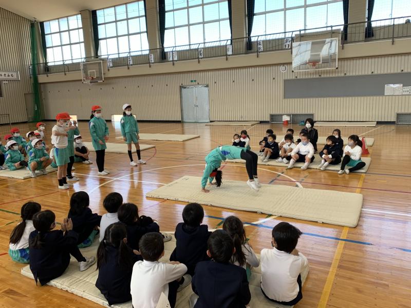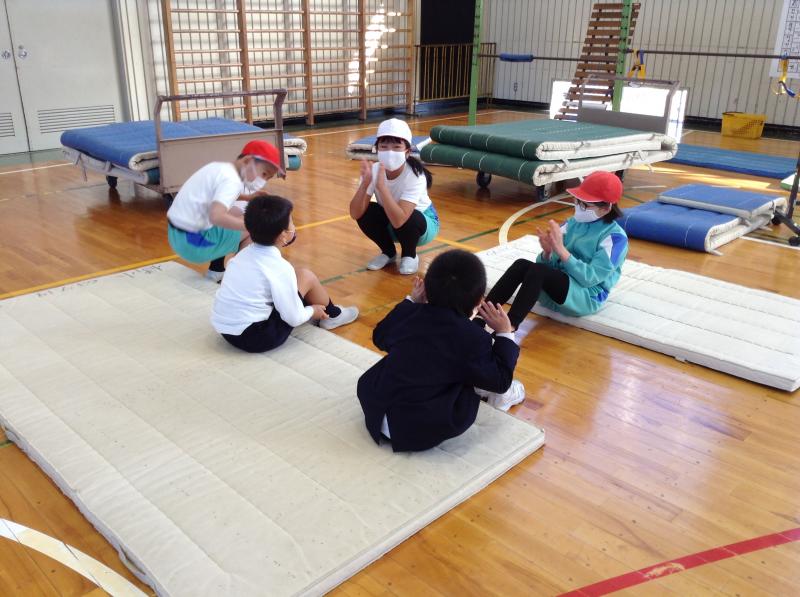 4年生が1年生にマット運動を披露、指導もしてもらいました。
