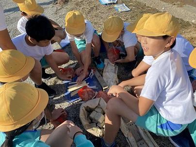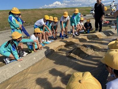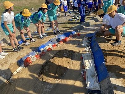 川の流れによる浸食を確認後、学校ごとにアイデアを出し合い、堤防を作って実験をしました。