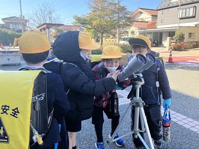 子どもたちがのぞいているのは、校長先生の対空双眼鏡です。月面の細かなクレーターを立体的に見ることができました。