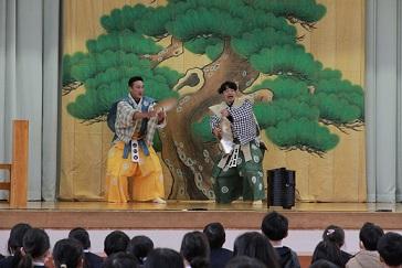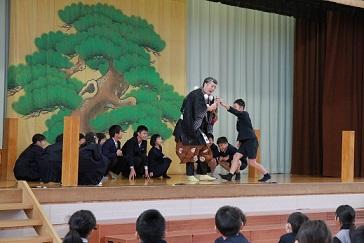 「令和5年度ー学校巡回公演事業ー大蔵流狂言」が行われ、橘小学校に能楽師の方が来てくださりました。「附子」と「柿山伏」の演劇を鑑賞しました。室町時代に使われていた言葉での表現でしたが、子どもたちもよく聞き理解しながら、楽しむことができていました。