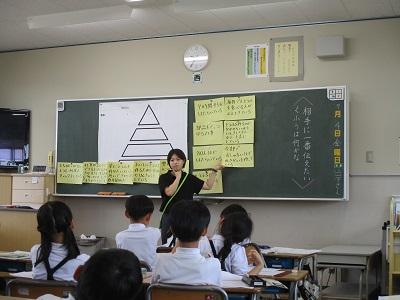 4年生の道徳の授業の学習風景です。明るく楽しい学級・学校づくりをテーマに考え、話し合いました。みんなの笑顔を咲かせるためには、様々な行動があること、行動に込めれた願いについて多面的・多角的に考えていました。