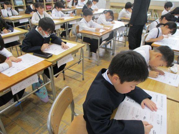 今年度は、特選15作品、入選15作品の入賞となりました。入賞者に限らず、この取組では、お手本をよく見て字形を美しく、適度な力を入れて入筆やはね・はらいを最後まで美しく、そして集中して最後までしっかりと取り組んでいる姿がたくさん見られました。素晴らしい作品が大変多かった中での30名の入賞者のみなさん、おめでとうございます!本日校長室で一人ずつ賞状を渡しました。