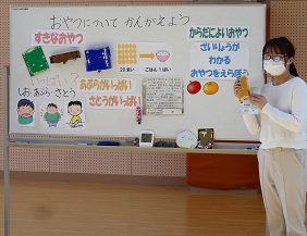 本日4限目に栄養士の河合先生をお迎えし、おやつに食べるおかしの食べ方について学習しました。チップス20枚でご飯一杯分。食べるなら体に良いおやつを食べましょうとお話していただきました。お話をしっかりと自分事として聴いていた1年生。「おやつも選んで食べたいな」など感想を上手にお話ししていました。