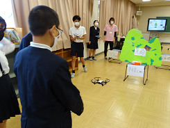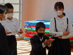 今日、金沢星稜大学の清水教授やゼミ生たちがやってきて、総合的な学習の時間「テディベアプロジェクト」のお手伝いをしてくれました。台湾へ送るビデオをドローンを使って上空から撮影。その前に、ドローンの操作を教えてもらいました。上下左右、iPadをコントローラーにしての操作に、6年生は大興奮でした。