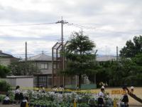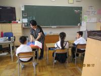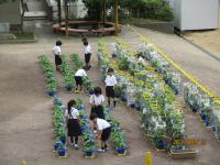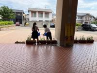 朝、玄関前の人権の花に水やりをしている3年生です。なかよく自分の仕事をしっかり取り組んでいました。1年生のプールの様子です。1年生には少し冷たいようでした。自分で水を体に掛けると背中が丸まっていました。その後、慣れると楽しそうでした。