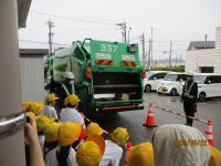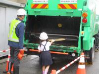 館野小学校の1年生と2年生の子どもたちが、お世話になっている館野小学校放課後子ども教室の様子です。地域の方々との、様々な体験活動を通して子どもたちを育てていきます。その一環としてゴミ収集車について学んでいました。段ボールを収集車に投げ入れ体験や目の前でゴミが潰れていく様子を見ていました。