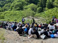 朝の集い、朝食の様子です。体調も崩す子もいなく全員元気です。いよいよ合宿で一番楽しみにしていた子が多かった「イワナつかみ」に出発です。