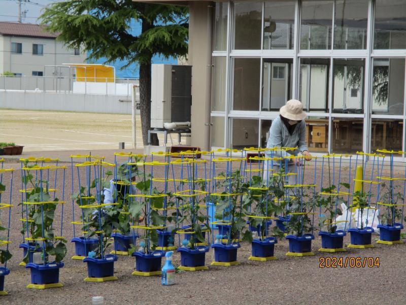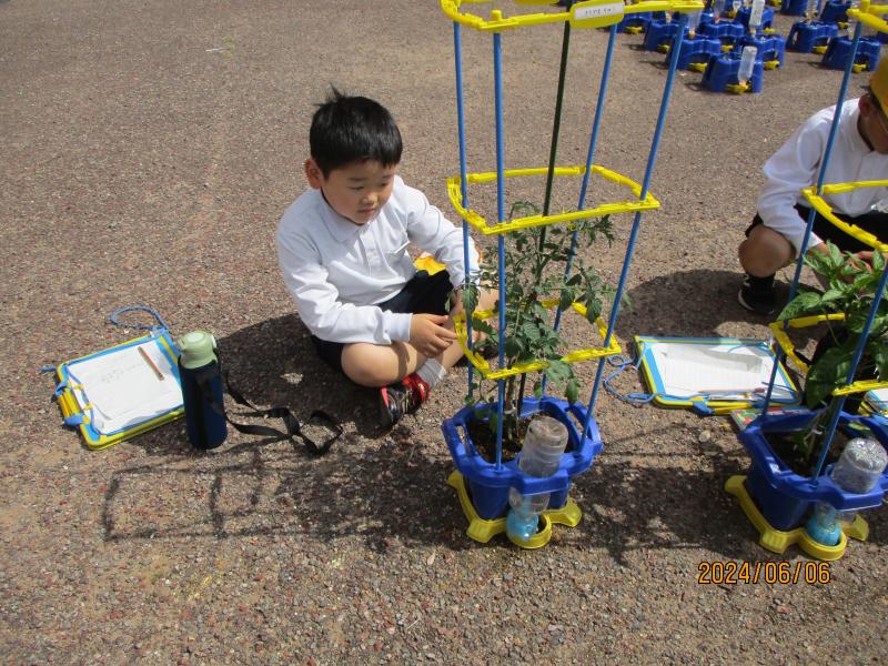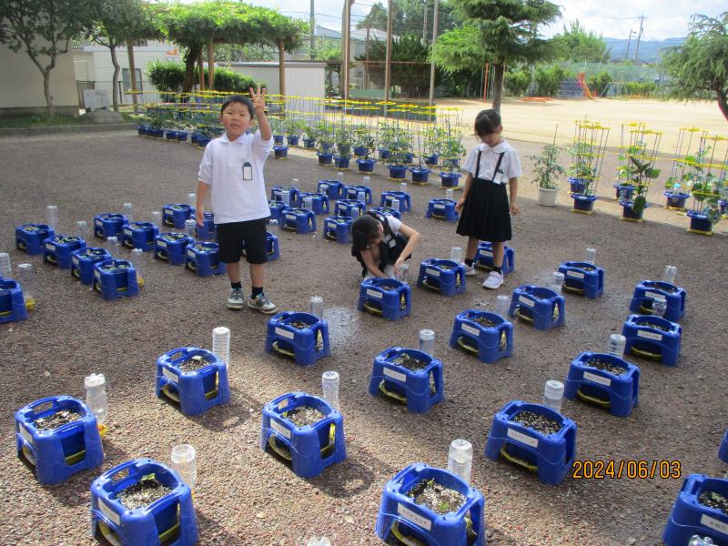 2年生は、夏野菜の苗を植えました。「妹がトマトが好きだしトマトを選んだよ」と妹思いの子もいました。