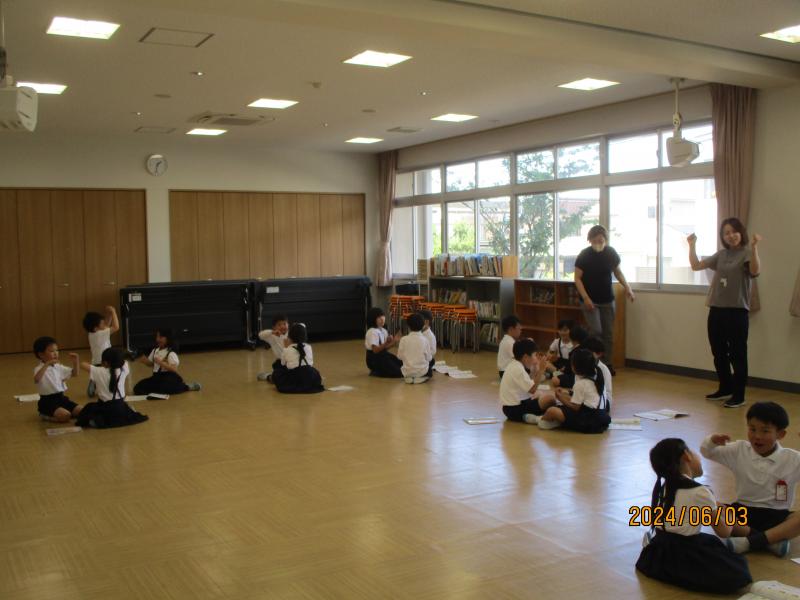 1年1組がプレールームで楽しく活動していました。折り紙で、クルクル回りながら落ちてくる「紙コプター」?で活動していました。活動後は、感想をしっかり発表し合いっていました。どの子も素敵な笑顔で活動していました。