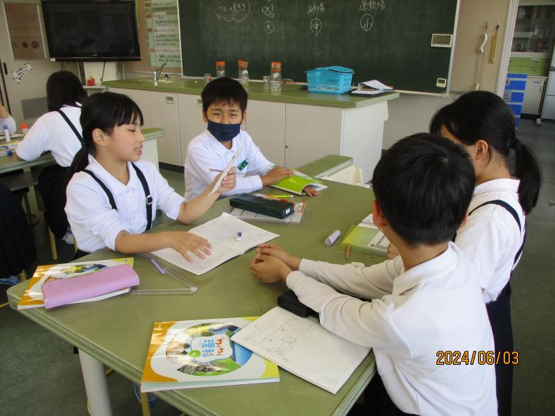 4年1組の学習の様子、班で話し合っています。