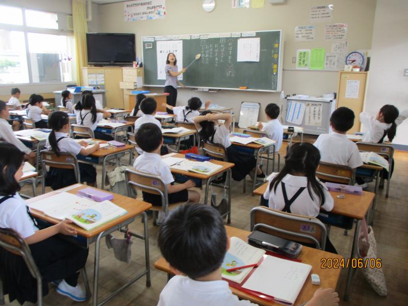 4年1組に教育実習生がきました。館野小学校卒業の高木さんです。朝の玄関で一緒にあいさつ運動に取り組んでいます。