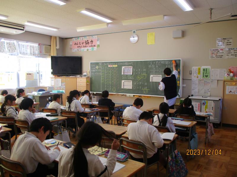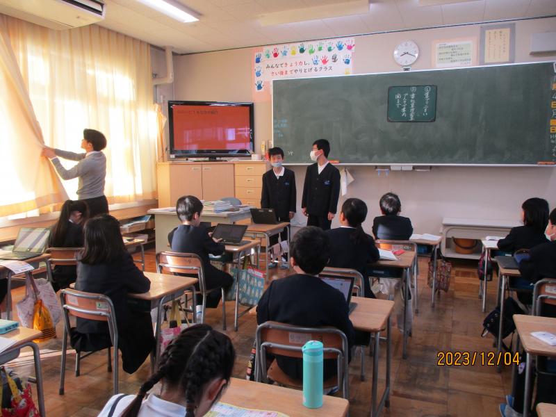 5年生が,朝の学習時間に,3年生の教室に出向き、総合的な学習の学びの成果を報告していました。