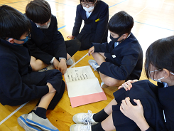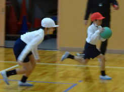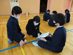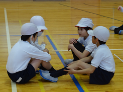 今日の体育はポートボール。チームで作戦を考え、どうしたら得点を奪えるか。やってみると面白い競技です。ゴールマンの前にいるガードマンは相手のシュートを必死に跳ね返していました。「広がれ!」「パース」声を出し、チームとして頑張る姿、そして終わった後もチームごとに作戦会議。まとまり感を感じた3年1組さんでした。