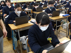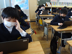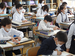 5年生は市が主催する学習到達度調査(国語・算数)に挑戦しました。設問への回答はタブレットを使いました。今回の実施を通して、コンピューターを使って実施するテストへの慣れや、既習事項の理解度を測り学習の自己調整力を育むきっかけとなればとのことです。今後、DXが進むことで教育だけでなく社会の様々なことが変化していくのでしょうね。