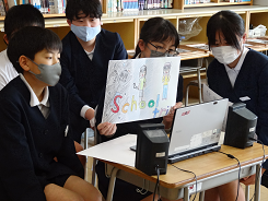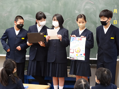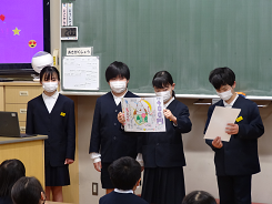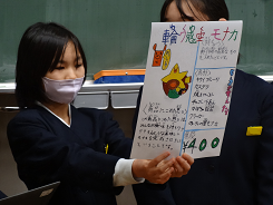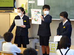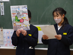 5年生がふがく堂さんとコラボしてつくったもなかについて、1年生の教室を訪れて宣伝をしました。宣伝に使ったポスターとスライドは5年生の「知ってほしい。買ってほしい」という思いが伝わるものになっていました。これで全学年への宣伝が終わりました。たくさん買ってもらえるとうれしいね。