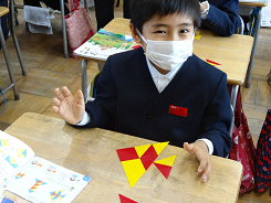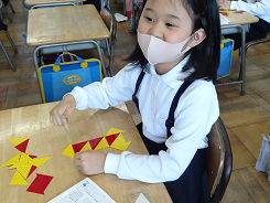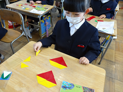 今日、1年2組さんは算数で二等辺三角形の赤と黄色のプレートを組み合わせながら形をつくる学習をしました。長辺と短辺をうまく組み合わせると四角ができたり、大きな三角になったり。ロボットやダイヤなど子どもらしい発想で作品がどんどんできあがっていました。上手に操作できていましたね。
