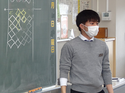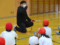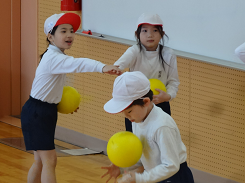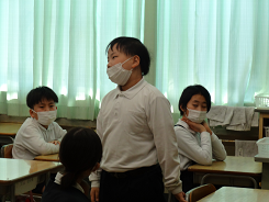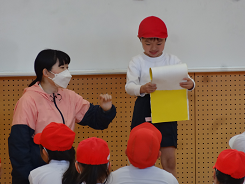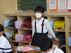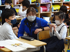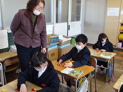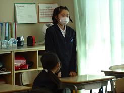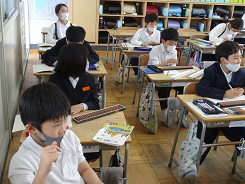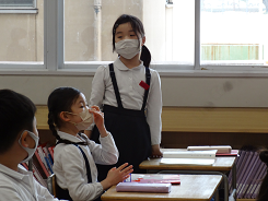 「動物になりきってかくれんぼをしよう」という課題で3年生が外国語活動をしていました。「Are you tiger?」「Yes,I am.」かわいい動物のお面をかぶって、ちょっと照れながらもがんばって英語で会話をしていました。