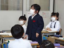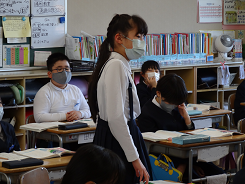 1年3組さんは国語「いいとこいっぱい一年生」の単元で作文の書き方を勉強していました。1年生になって「驚いたこと」「がんばったこと」などをどうやって書いたら良いのかをたくさん見つけて発表していました。学校で取り組んできた「話し手を見て聴く」や学級ルールもしっかりとできていて、楽しそうに学習していました。