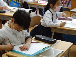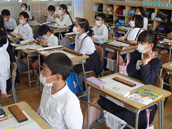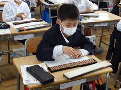 算数でそろばんの学習をしました。初めてさわる子も多く、戸惑う様子が見られました。時間が経つと少しずつ玉の動かし方もわかってきたようでした。計算を正確に早くするために昔から使われているそろばん。前田利家もそろばんを大切に使っていたと聴いたことがあります。今日は多くの子にとって、貴重な体験だったと思います。