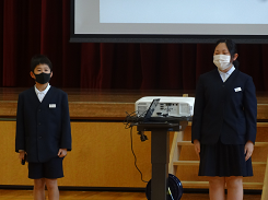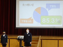 今朝、体育館にて第2回表彰伝達式と児童集会を行いました。1年生が集会デビュー! 姿勢良く、静かに参加できました。また、児童集会では運営委員さんから今年度の児童会目標の達成割合が紹介されました。85.3%の達成で大成功!
