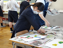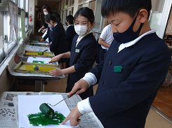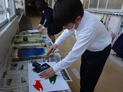 どんな版で絵をつくろうかな 画用紙を切り抜いてつくった版を使って版画に挑戦。ローラーを動かしながらカラフルで動きのある作品づくりに取り組んでいました。画用紙からはみ出させたり、上の方に集まるように配置したりと工夫一杯の2組さんでした。