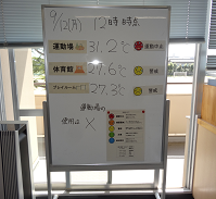 本校職員室の一番目につくところに、山瀬先生が測っている「暑さ指数(WBGT)」が掲示されています。随時更新している中で、今日は12時を回った時点で運動場は「運動中止」となってしまいました。運動場の使用がだめでも、校舎の中で子どもたちは工夫しながら、様々な場所で思い思いに過ごしています。スポーツの秋を満喫できるぐらいの涼しさが恋しい今日この頃。