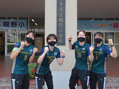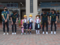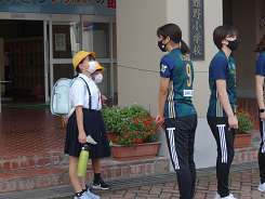 今朝、北國銀行ハンドボール部「Honey Bee」の選手4名が来校し、登校するたちのっ子にむけて児童玄関前で挨拶をしてくれました。昨日、福嶋先生からHoney Beeの選手が来校するお話はあったのですが、びっくりした様子や恥ずかしそうな表情もたくさん見られました。1年生は一緒に挨拶もしていました。児童玄関に掲げられている看板のように、挨拶を頑張りましょう。