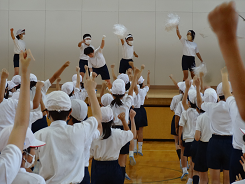 台風一過、気温がぐんと下がり、今日は朝から雨も降っていました。そのため、全校応援練習は白赤順番に体育館で練習に変更しました。声は出せませんが、手拍子や動きで応援の気持ちを表しています。応援団を中心に本番を盛り上げていきます。