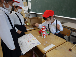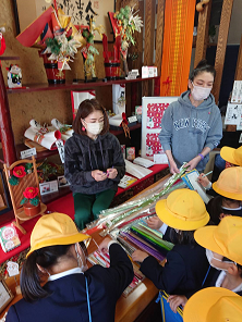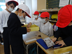 今月、2年生は生活科の学習で町探検を行っています。今日は先日の2組に引き続き、1組が内村畳店さん、かねこ結納品店さんへお邪魔させていただきました。内村畳店さんでは、畳の歴史や材料を教わり、大きな針などを使って実際に畳を縫うところを見せていただきました。また、かねこ結納品店さんでは、水引の意味をお話いただいたり、石川県伝統の結納品の作品や水引の編み方などを見せていただきました。普段目にしない物ばかりで、子ども達は終始「すごい!」と感動していました。自分たちの住む町の魅力に気づくことができた町探検でした。