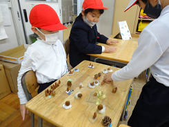 どんぐりなど秋にとれた実を使い、1年生は秋祭りを行いました。迷路屋さんや的当て屋さん、アクセサリー屋さんなど、工夫したお店が一杯でした。先日、2年生が遊びのお店を開いて招待しくれたことがいきているようです。学びはつながります。