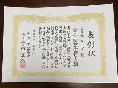 11月26日(土)地場産業振興センターで行われた石川県小中学校PTA大会にて、館野小PTAは広報誌レイアウト賞をいただきました。広報部さん、おめでとうございます。次回発行予定の広報誌もレイアウトの良さだけでなく、読み応えあるものになっています。楽しみにしていて下さいね。
