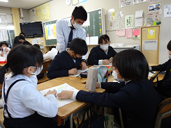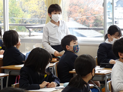 音楽会の感動を言葉にし、詩で表現しようをねらいに国語科単元「感動を言葉に」の研究授業が4年1組で行われました。感動を伝える方法として繰り返しの技(わざ)やオノマトペを使う技を見つけていました。リズムに着目した子は、詩と音楽をつなげて話していました。さすが音楽会を立派にやり遂げた4年生です。さて、感動が伝わる詩になったかな!?