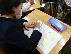 先月、今月と研究授業が集中しています。これまでの学習の成果をだそうと子どもたちも先生たちも頑張っています。さて、今日は5年2組で教材『あなたはどう考える』で「目指せ なるほど、なっとく意見文マスター」をめあてに学習しました。読み手が納得いくような意見文にするためにバタフライチャートを使い、主張と反論を分けてしっかりと考えていました。