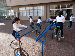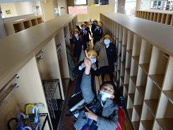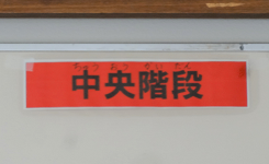 学校には中央階段、東階段、南階段、そしてプレールームと体育館を結ぶ階段の4つの階段があります。先月行った引き渡し訓練の計画を立てていた際、階段名と場所がわかりづらいということが課題となりました。当日は旗を立てて登り下りを明確にしましたが、誰にでもわかりやすくすることが必要と考え、中央階段のステップに赤丸を付けました。これから中央階段は「赤」としていきます。その他の階段も順次取り組む予定です。これはユニバーサルデザインであり、「誰も取り残さない」というSDGSの一つです。