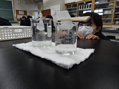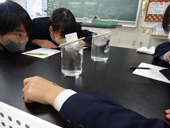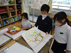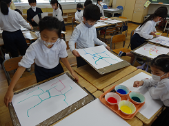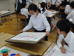 先生方にも得意とする教科があります。5年生の鳥田先生は理科。2年生の高橋先生は図工。今日は5年生が理科「もののとけ方」で塩と片栗粉の溶け方を観察する授業をしていました。「とける」とはどういうことか。これから探究が始まります。2年生は「絵の具をたらした形から」の授業で、大きな画用紙に4色の絵の具をたらして線を描いていました。面白い形ができあがり、2年生は大喜び。この後、どうなるのかな。