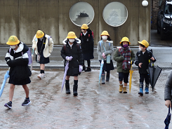 天気予報通り今日は気温も低く、降雪はありませんでしたが強風が吹き荒れました。学校のきまりでは登下校に黄色い安全帽をかぶることとしています。視認性にも優れる黄色い帽子。それでも、風が強いときには、飛ばされないよう帽子をランドセルの中に入れるように話をしています。帽子のゴムが伸びている。ゴム自身がとれてない子もいます。安全のためにもゴム紐の確認もお願いします。(写真の子たちはこの後、ランドセルに帽子を入れましたよ)