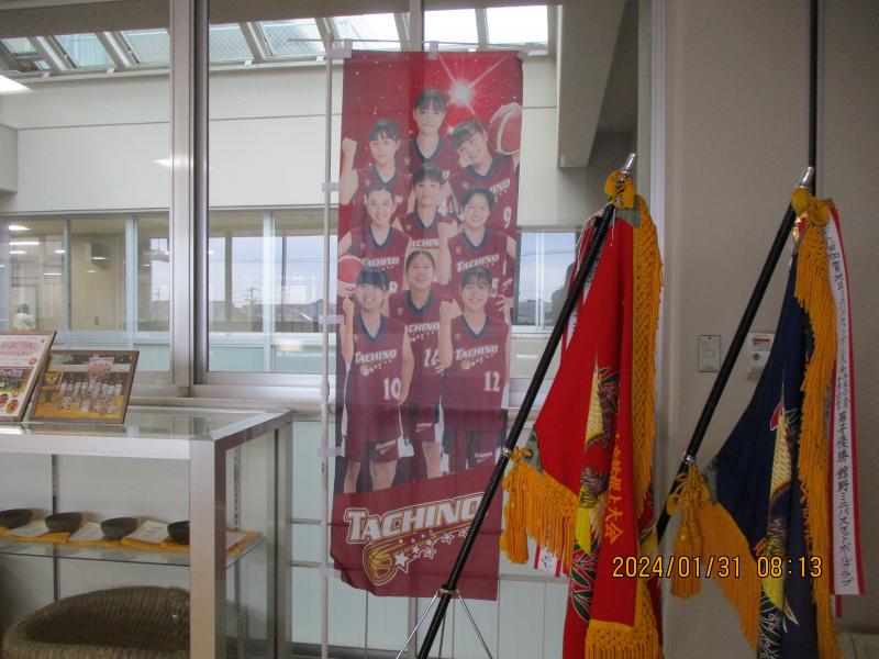 館野ミニバス(女子)の、のぼり旗を飾りました。素敵な笑顔です。