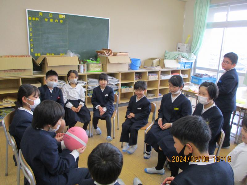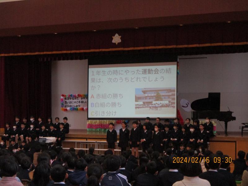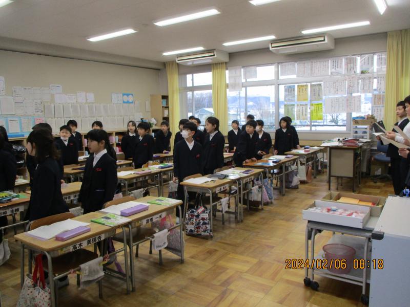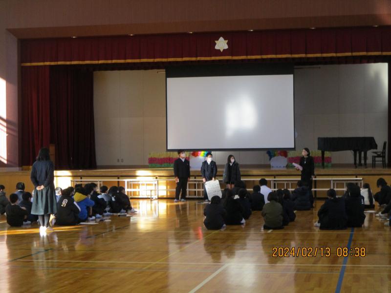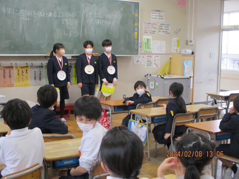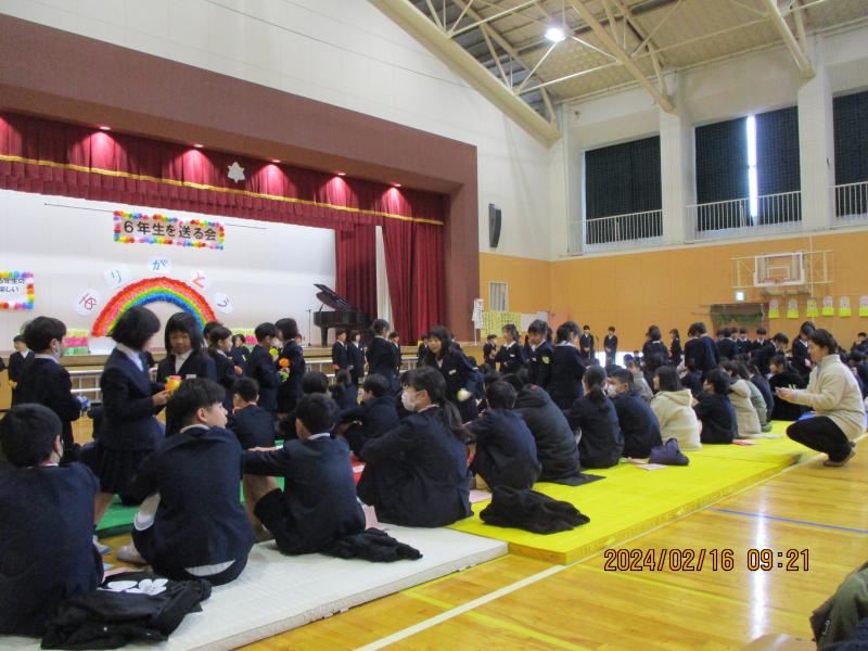 昼休みに、各縦割り班で「あらがとうの会」がありました。5年生が司会で、各学年が役割を分担して6年生へ感謝気持ちを伝えました。6年生の中には「まじで、うれしい」「ありがとうね」と感謝の言葉や涙ぐんでいる子もいました。