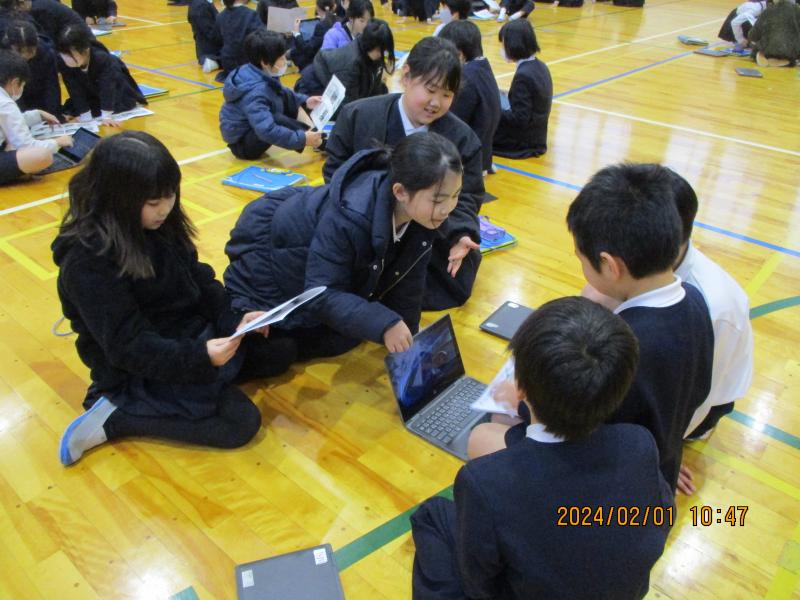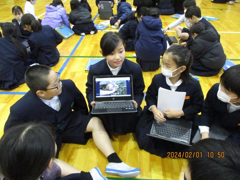 学校では,ウサギやカメ、金魚を飼育しています。主に4年生がお世話をするのが伝統らしいです。今年の4年生の一生懸命にお世話してくれました。このお世話の引き継ぎがありました。実行委員が中心に、居着くかのグループに分かれ、3年生に飼育マニュアルやクロームブックを使いプレゼンテーションしていました。