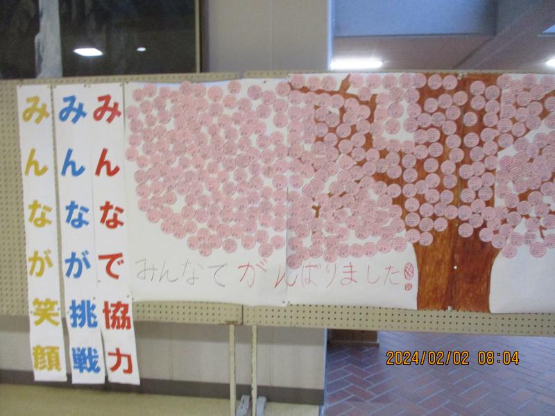 玄関に,一足早く桜の花が満開になりました。子ども達がこの1年間頑張ったことを書いて貼り付けて掲示してあります。「運動会の綱引き頑張った」「給食残さず食べた」「算数がんばった」「委員会で全校のため頑張った」など,それぞれが自身の頑張りを書いていました。今夜、お子さんに「何を頑張ったの?」って聞き、たくさん褒めてあげてください。おうちの方の一言が、自信につながり、新たな挑戦につなげて欲しいと思います。