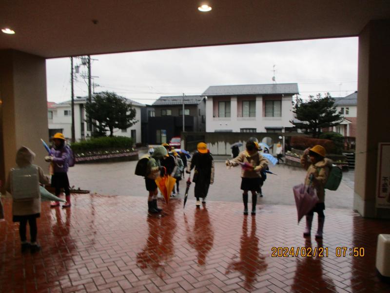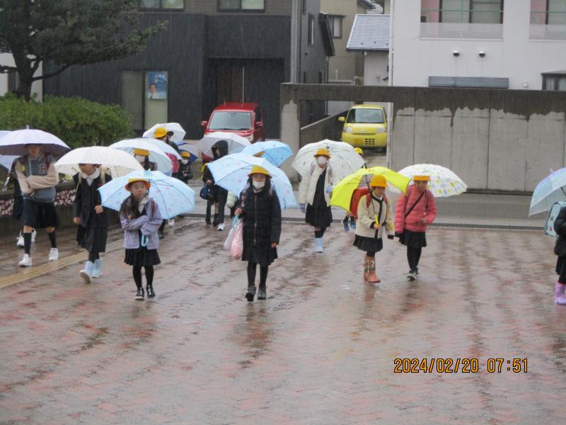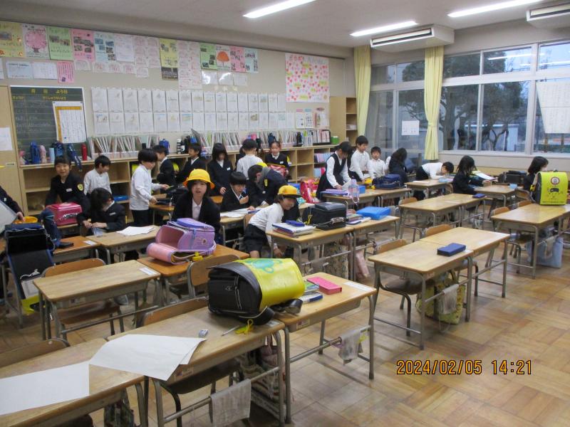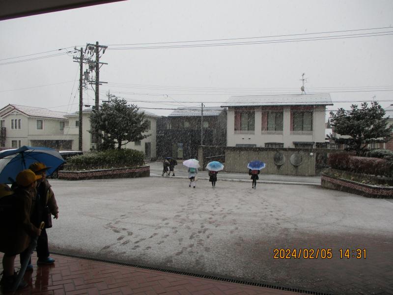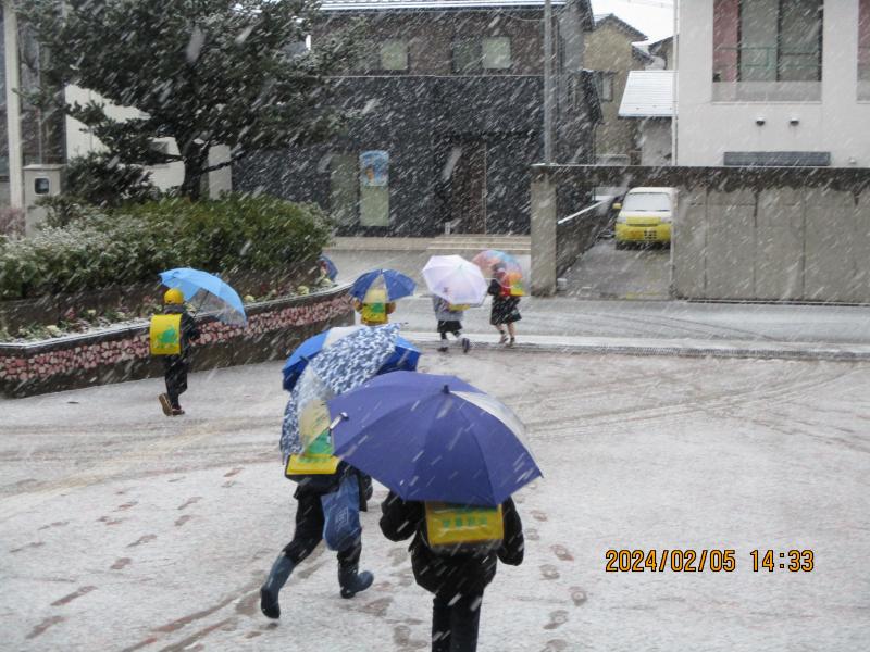1年生が授業が終わり、帰りの準備をしています。外は雪でうれしそうでしたが、玄関に出ると「寒い」「寒い!」と叫んでいました。
