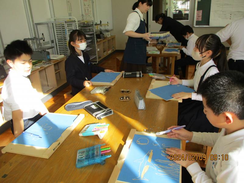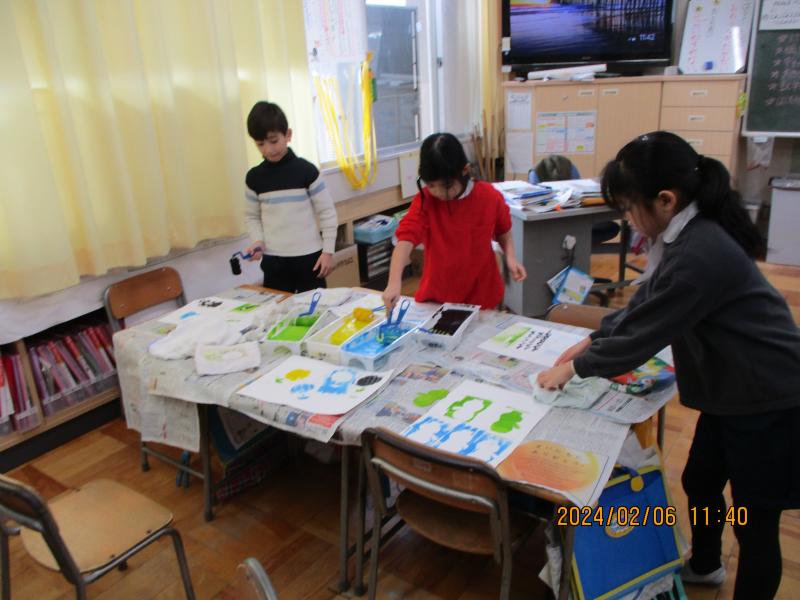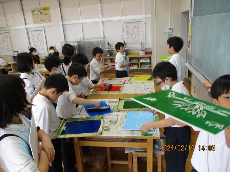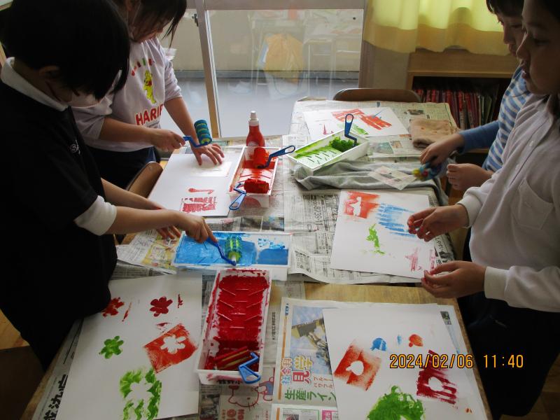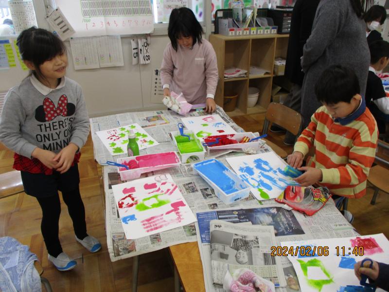 2年生の図工です。汚れてもいい服を着て楽しそうに版画をしていました。