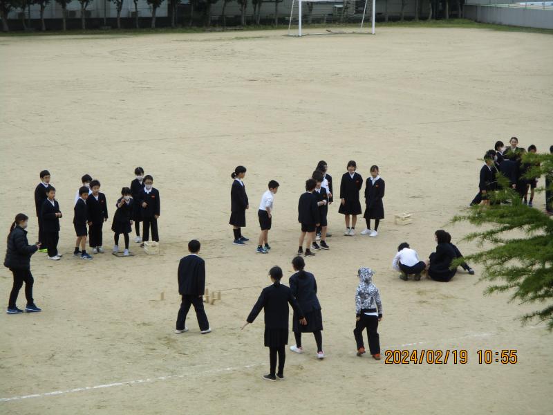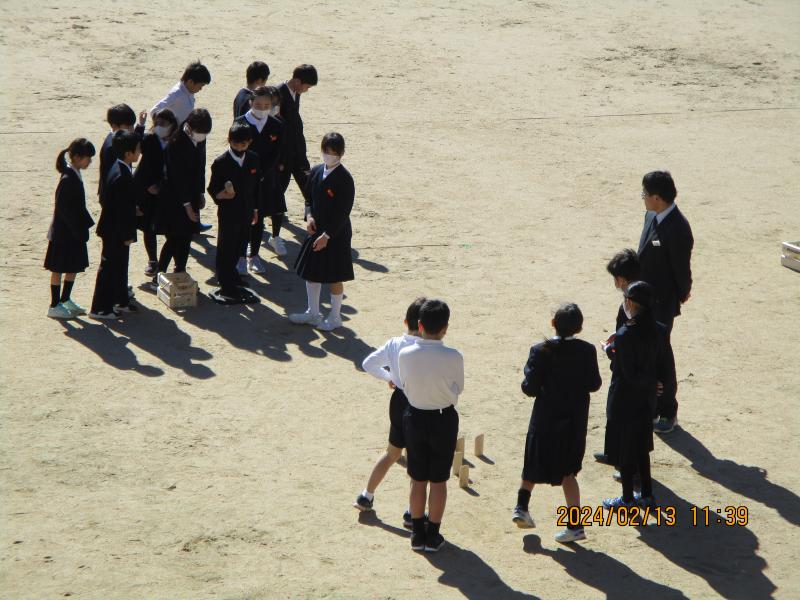 5年生は、次年度のクラブ活動発足に向け、学年集会を開いていました。4年生や5年生が楽しく活動できるクラブを作ってください。4年生は楽しくモルックをしていました。歓声がすごく盛り上がっていました。1年生は、お尻にタグをつけて取り合う、鬼ごっこをしていました。
